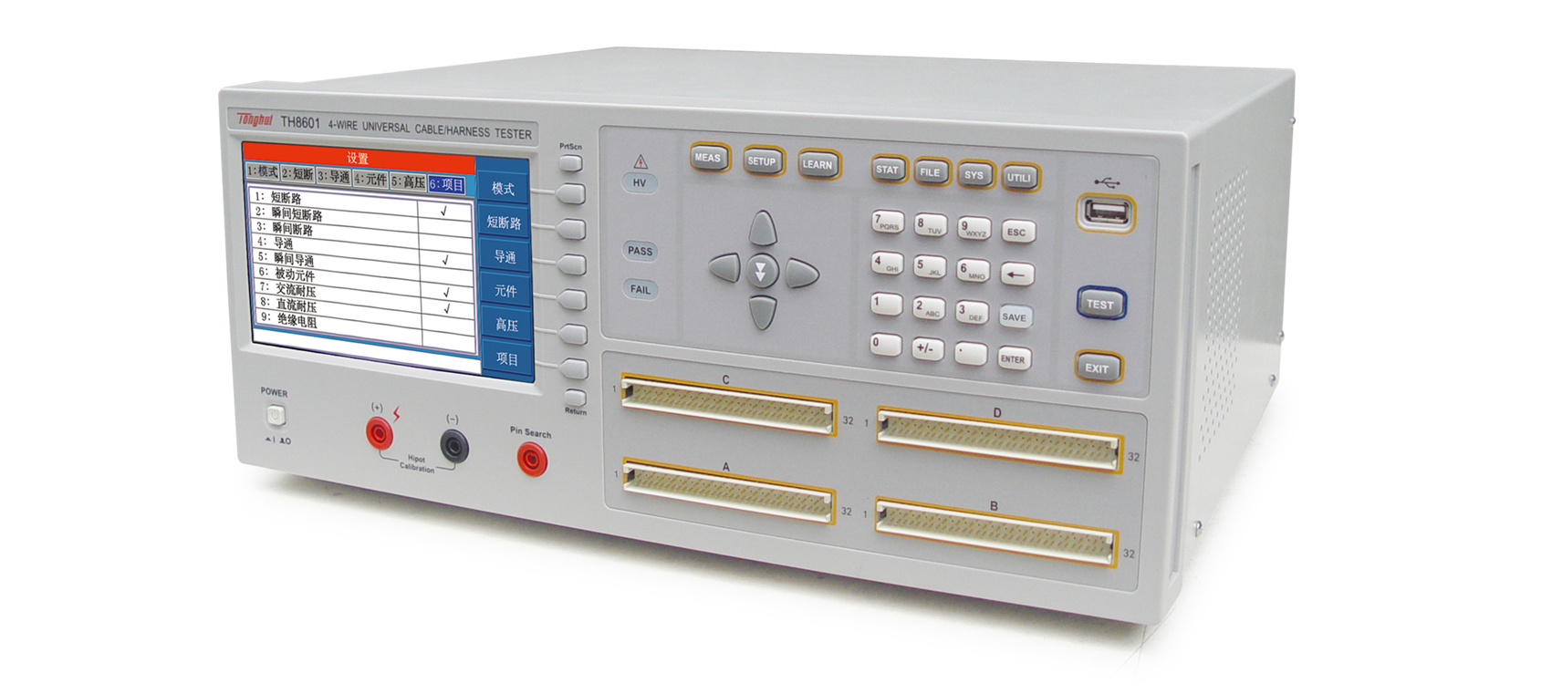 ■ TH8601系列四端線材綜合測(cè)試儀是專用于各種線纜,線束和排 線品質(zhì)及連接可靠性檢驗(yàn)的多功能,自動(dòng)化的線材綜合參數(shù)測(cè)試 系統(tǒng)。該系統(tǒng)提供可編程的恒流恒壓源以及高壓源,測(cè)試項(xiàng)目涵蓋了導(dǎo)通,被動(dòng)元件(電感,電阻,電容,二極管),交直流耐壓,絕緣電阻各種高低壓參數(shù)。本系統(tǒng)采用先進(jìn)的LCR數(shù)字采樣及高速長(zhǎng)壽命通道切換技術(shù),大大提高了測(cè)試精度,速度以及使用壽命。采用高低壓分離技術(shù),大大的提高絕緣電阻的測(cè)試性能。豐富的接口設(shè)計(jì),本儀器還提供RS232, RS485, GPIB, USB, Handler等接口,便于用戶運(yùn)用于自動(dòng)化檢測(cè)和自動(dòng)化產(chǎn)線。