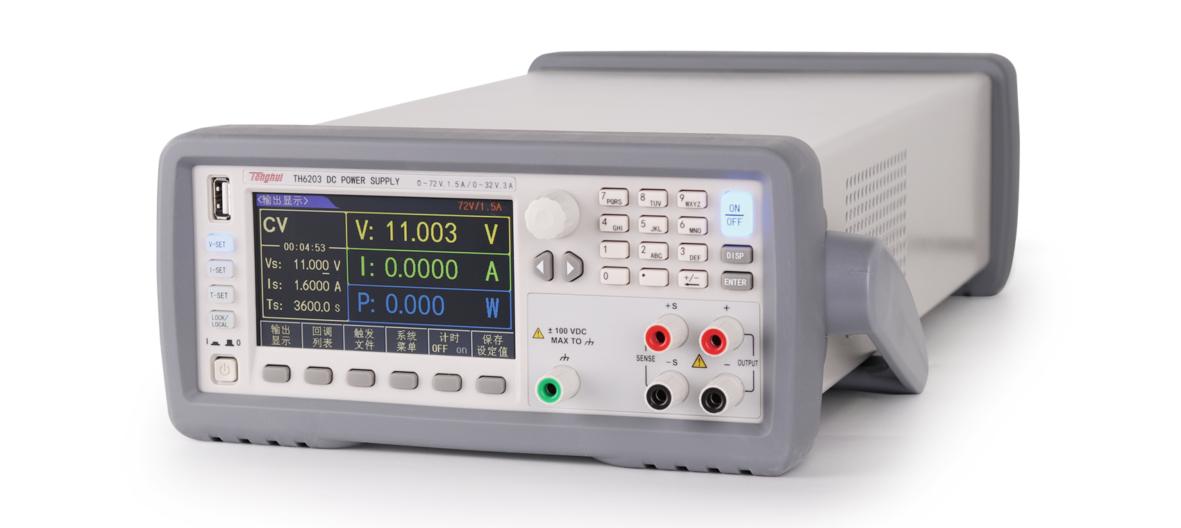 TH6200全系列配備4.3寸TFT LCD顯示屏,所有設(shè)置參數(shù)和輸出參數(shù)同時(shí)顯示在同一屏幕中。屏幕左側(cè)對(duì)應(yīng)于參數(shù)設(shè)置區(qū)域配備了電壓、電流、時(shí)間快速設(shè)置按鈕,使用起來(lái)更加方便、直觀。數(shù)字編碼旋鈕、數(shù)字鍵盤(pán)可快速準(zhǔn)確地輸入設(shè)置參數(shù),避免了電位器調(diào)節(jié)帶來(lái)的效率低下和不精確問(wèn)題,輸出切斷開(kāi)關(guān)可有效保護(hù)被測(cè)件和儀器本身。