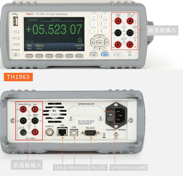 TH1963 配備齊全的通訊接口,如RS-232、USB HOST、USB DEVICE、LAN和HANDLER多種接口可供選擇。讓您在多種場合,都能有方法與控制器建立可靠連接,減少對其它設備的依賴,消除由觸發(fā)時序和過程控制等引入的復雜情況,大幅度縮短測試時間。TH1963克服了常規(guī)數(shù)字多用表只能前面板接線造成的美觀問題,具有前后面板都可輸入的設計特點,便于集成到標準機箱。