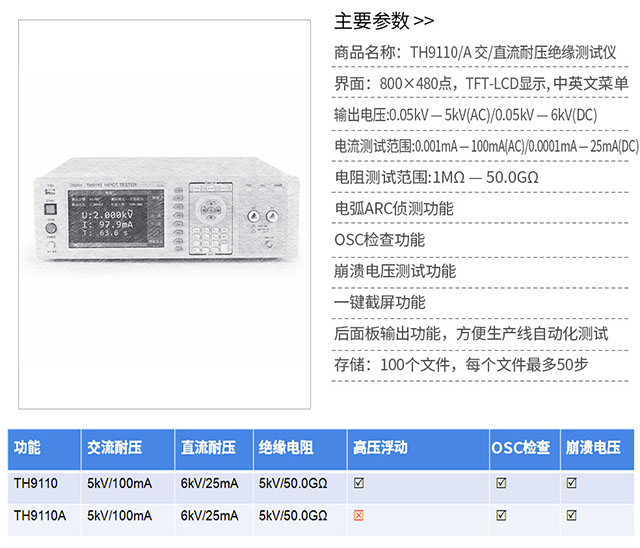 TH9110/TH9110A系列除了基本的交流、直流、絕緣電阻測(cè)試外,還增加了崩潰電壓測(cè)試功能,可分析產(chǎn)品的擊穿點(diǎn)電壓,滿足特定客戶對(duì)產(chǎn)品高壓可靠性檢測(cè)的要求;同時(shí)具有開短路檢測(cè)功能,解決了用戶在測(cè)試安規(guī)產(chǎn)品時(shí)的可靠性和準(zhǔn)確性問題,輸出時(shí)同步進(jìn)行接觸檢查,避免漏檢,提升測(cè)試可靠度與效率。