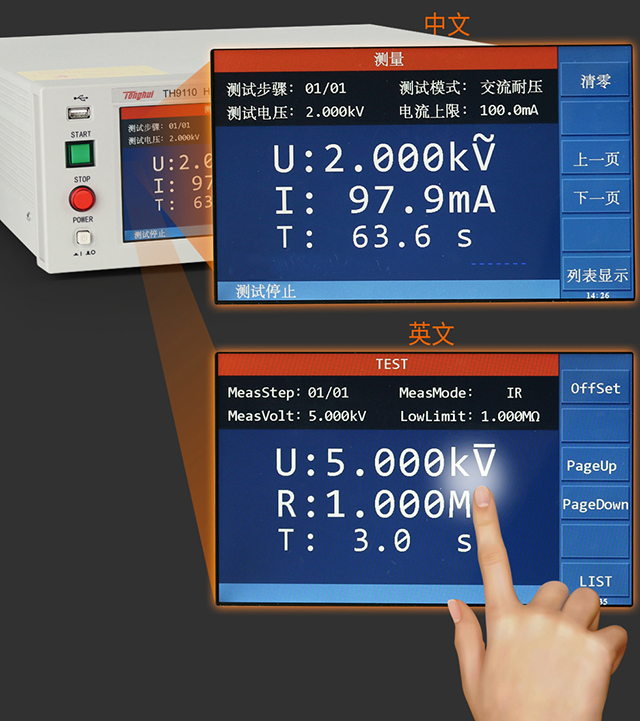 TH9110/TH9110A系列使用7寸LCD彩色顯示屏,并將測(cè)試結(jié)果用大字符顯示,更加清晰直觀,方便您接下來(lái)的操作與判斷。同時(shí)浮地輸出設(shè)計(jì)、觸電保護(hù)功能等,更加確保了客戶即使在不小心接觸到高壓測(cè)試端的時(shí)候也不會(huì)被電擊傷害,從而保護(hù)操作人員的安全,操作時(shí)無(wú)后顧之憂。