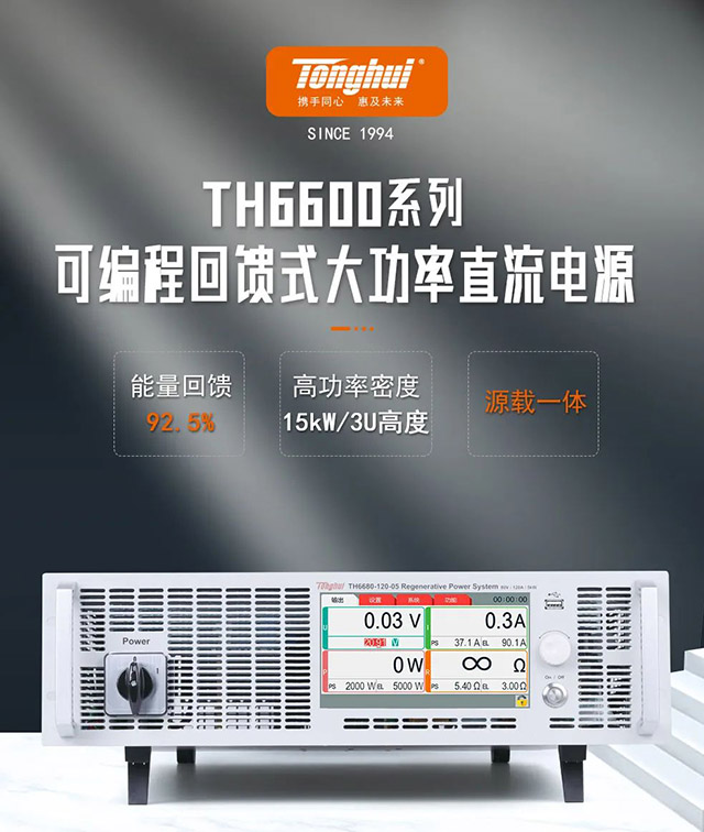 TH6600系列雙向大功率直流電源的高功率密度、高效率、可回饋的特點在動力電池、儲能系統(tǒng)、充電樁、風(fēng)能/太陽能、新能源汽車、電信、電力、大功率電器設(shè)備等領(lǐng)域的應(yīng)用提供了更好、更高效、更節(jié)能的解決方案。