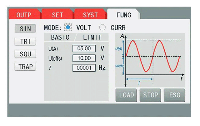 TH6600系列內(nèi)置了可形成如下典型函數(shù)的真實函數(shù)發(fā)生器,并能將它們應(yīng)用于輸出電壓或輸出電流上。波形可通過前面板設(shè)置,或通過上位機、USB上傳。儀器內(nèi)置了如下標(biāo)準(zhǔn)波形,可隨時調(diào)用。